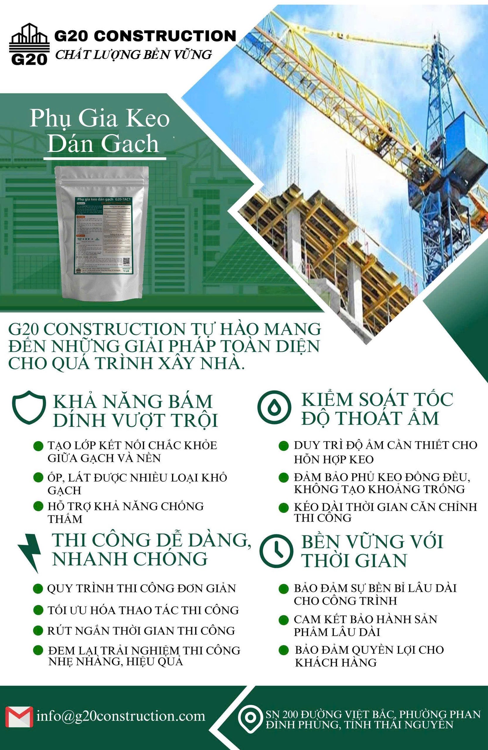 Xu hướng sử dụng gạch khổ lớn, gạch đá tự nhiên đang ngày càng phổ biến trong các công trình hiện đại. Tuy nhiên, hồ dầu truyền thống thường không đảm bảo độ kết dính, dễ gây bong tróc. Phụ gia keo dán gạch G20 là giải pháp công nghệ mới giúp biến vữa thường thành lớp keo siêu dính, đảm bảo chất lượng bền vững cho mọi hạng mục ốp lát.